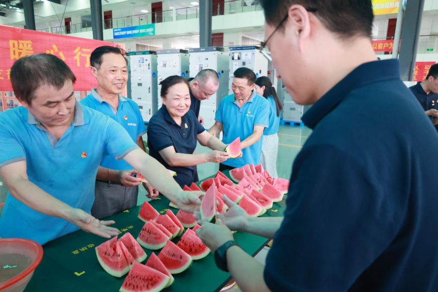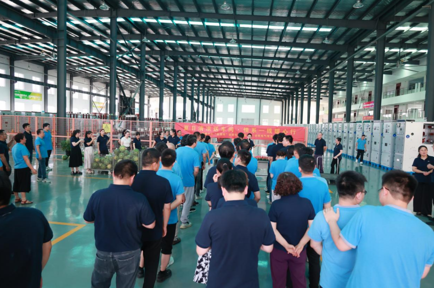 7月8日,炎炎夏日送关怀,leyu电气党支部携手营销中心温情启动“夏日清凉送车间·情系一线暖心行”活动。营销中心领导及党员代表深入生产一线,为辛勤工作的员工们送上了西瓜、矿泉水、冷饮等降温物资,用实际行动传递组织的关怀与夏日的清凉,进一步增强了团队的凝聚力与向心力,让一线员工感受到了leyu家的温暖与企业的深情厚谊。